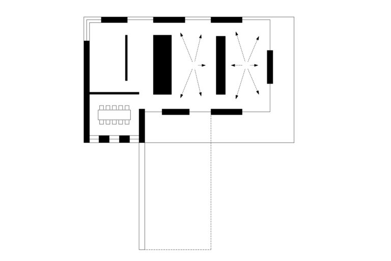 Grundgedanke des Entwurfs ist es das Gegensatzpaar Intro- und Extrovertiertheit im Wohngefühl erlebbar zu machen. Großflächige Öffnungen wechseln sich mit raumbegrenzenden Wandscheiben ab, die mit Bildern versehen werden sollen. Eine Sonderstellung im Familienleben erhält das Esszimmer, der Fokus soll hier auf dem großen Tisch liegen, sprich räumlich introvertiert sein. Die schachbrettartige Ausführung der Außenwand spielt mit diesem Umstand und lässt die Außenwelt nur in Fragmenten am Esstisch Platz nehmen.